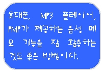 그렇다고 보이스레코더를 굳이 살 필요는 없습니다. 짤막한 음성 메모용으로만 활용하려고 한다면 MP3 플레이어, 휴대전화에 있는 녹음 기능을 사용하는 것도 좋은 방법입니다. 녹음 기능을 편리하게 사용할 수 있는 PDA가 있다면 그것을 사용해도 좋습니다. 어느 것을 사용하든 ‘목소리로 메모하는 습관’이 중요합니다.