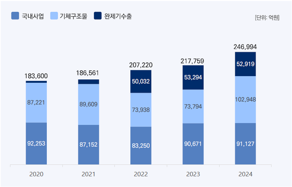 완제기 수출 및 KF-21 양산 준비도 재무 부담을 키웠다. 2019~2021년 수주잔액의 2~5% 수준이었던 완제기 수출 비중은 2022년 이후 30% 이상으로 급등했다. 2020년 4166억원에서 올해 상반기에는 5조9935억원에 달했다.