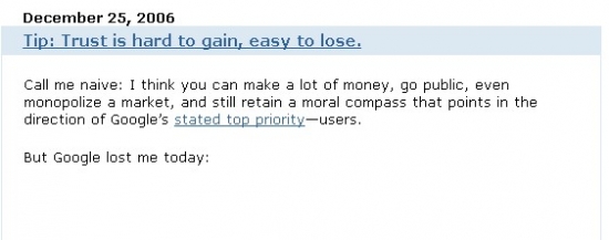 이외에도 블레이크 로스의 글에는 구글이 검색외에 e메일 서비스, 인스턴트 메신저 등 다양한 분야로 영역을 확대함에 따라 사용자 지향적이란 말과 멀어질 가능성을 우려하는 모습도 엿보입니다. 사용자를 배려하겠다고 약속했던 만큼, 앞으로도 관심을 갖고 구글의 행보를 지켜보겠다는 클로징 멘트도 인상깊에 다가옵니다.