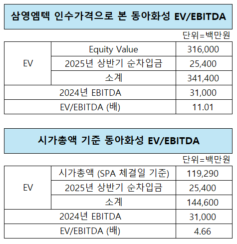 해당 가격을 토대로 전체 발행주식수를 계산하면 동아화성의 지분가치(Equity Value)는 3000억원을 훌쩍 넘어선다. 여기에 순차입금을 포함한 기업가치(EV, Enterprise Value)는 약 3414억원이다. 지난해 상각전영업이익(EBITDA)이 310억원 수준임을 감안하면 EV/EBITDA는 11.01배로 추산된다. 이 회사가 1년 동안 벌어들이는 EBITDA의 11년치 현금창출력을 주고 인수하는 셈이다.