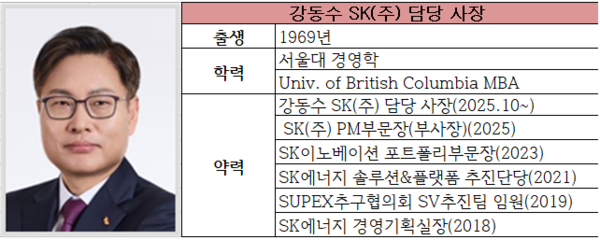 강 사장은 1969년생으로 브리티시컬럼비아대에서 경영학석사(MBA) 과정을 이수한 뒤 SK이노베이션 비서실팀장을 맡아 구자영 부회장을 오랫동안 보좌했다. 이후 △2014년 SK트레이딩인터내셔널 코퍼레이트서비스실장 △2018년 SK에너지 경영기획실장 △2019년 SK이노베이션 수펙스추구협의회지원실 임원 △2021년 SK에너지솔루션&플랫폼추진단장을 거쳐 2023년 SK이노베이션 포트폴리오부문장(부사장)으로 승진했다. 2024년 연말인사에서 SK㈜ PM부문장(부사장)으로 옮긴 뒤 올해 인사에서 사장으로 승진했다.