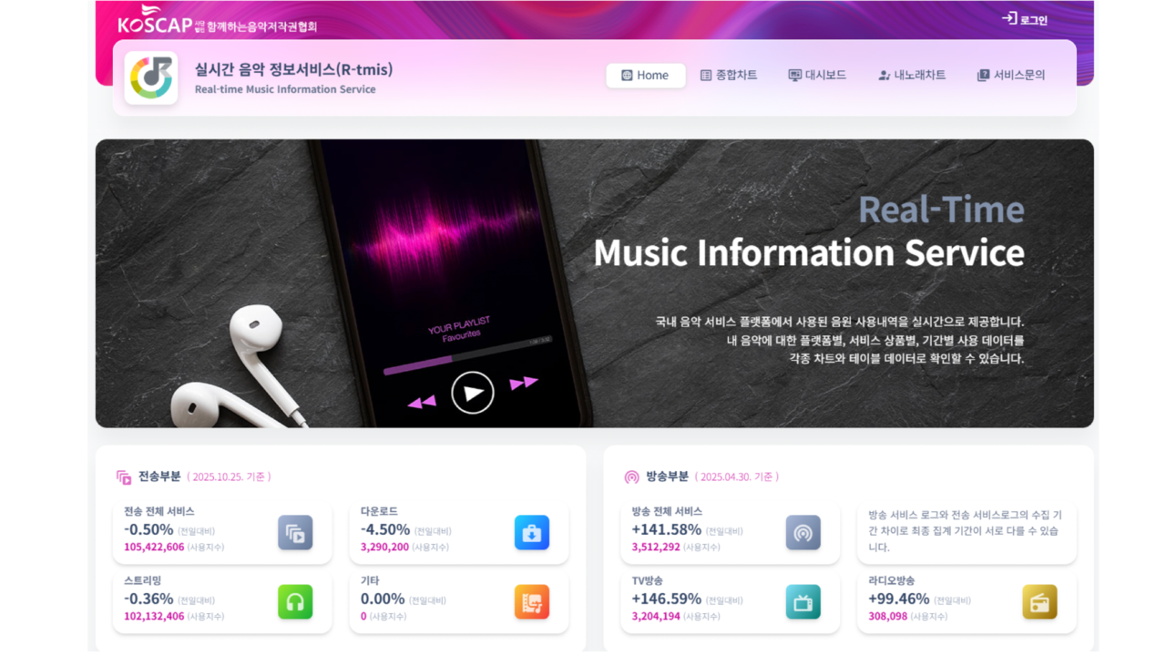 R-tmis는 멜론, 지니뮤직, 바이브, 벅스, 플로 등 주요 음원 서비스의 로그를 UCI 기반으로 수집해 저작자에게 재생 현황을 제공해온 서비스다. 이번 고도화를 통해 스트리밍 영역을 넘어 지상파·종합편성채널·일부 PP 채널 등 국내 주요 방송사 데이터까지 확인할 수 있게 됐다.