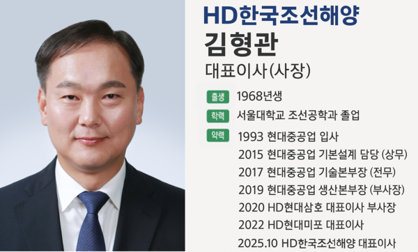 HD현대그룹이 김형관 사장을 중간지주사인 HD한국조선해양 대표이사(사장)에 내정했다. 김 대표는 그간 HD현대그룹 조선 계열사를 두루 챙기며 조선업 호황기를 이끌었다. 특히 로봇 자동화 등 기술 분야에 강점을 가져 향후 차세대 HD현대그룹 조선 계열사의 기술력 부흥을 이끌 적임자로 평가된다.