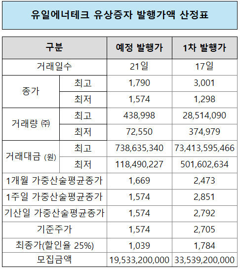 13일 금융감독원 전자공시시스템에 따르면 유일에너테크는 주주배정 후 실권주 일반공모 유상증자의 1차 발행가액을 1784원으로 결정했다. 예정 발행가액(1039원) 대비 745원 증가했다. 이에 잠정 모집 규모는 기존 195억원보다 71% 증가한 335억원으로 늘었다.