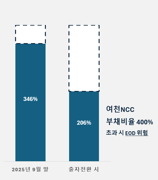 여천NCC는 회사채 투자자와의 약정에 따라 연말 부채비율이 400%를 초과할 경우 조달 자금을 강제로 조기상환해야 할 가능성이 높았다. 한 채권에서 문제가 발생하면 여러 채권이 연달아 '기한이익상실(EOD)' 트리거를 터치하는 크로스디폴트 조항이 적용됐기 때문이다. 하지만 출자전환할 경우 한숨을 돌리게 된다.