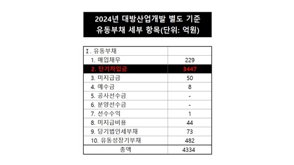 이전부터 대방산업개발이 활용하는 단기 부채의 절반 이상은 대방건설로부터 나왔다. 지난해 말 대방산업건설의 단기차입금 3447억원 중 58.5%인 2018억원이 대방건설의 몫이었다. 1년 안에 갚아야 하는 전체 유동부채 4334억원 가운데 대부분인 79.5%가 단기차입금임을 고려하면, 그만큼 해당 자금 조달 영역에서 대방건설에 대한 의존이 크다는 뜻이다.