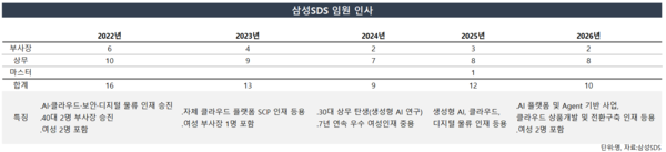 삼성SDS의 최근 5년간 정기 임원인사에서는 매년 10명 내외의 임원 승진자가 나왔다. 주로 AI와 클라우드 관련 사업부서의 인재다. 하지만 물류사업부 임원도 1명씩 포함됐다.