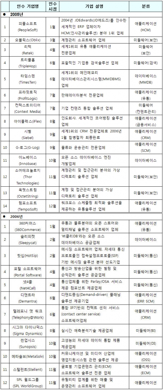 아래 표는 오라클이 2005년과 2006년에 인수합병한 회사들이다. 오라클의 인수 합병 전략에 대해 한국오라클은 "고객에게 제공할 수 있는 제품의 폭을 넓히고, 고객의 요구 사항에 더욱 빠르게 대응하며, 협력 관계를 넓히기 위한 것"이라며 "오라클 인수합병 철학의 핵심은, 매출을 높이고 주주에게 가치를 제공하는 동시에 고객에게 서비스와 제품 지원에 대한 약속을 지속적으로 이행하는 것"이라는 지극히 원론적인 답변을 한다.