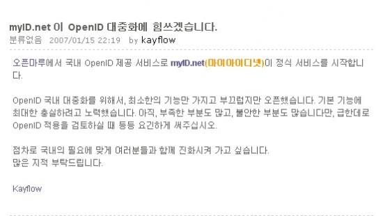 오픈ID는 요즘 국내 블로고스피어에서도 종종 이슈가 되고 있습니다. 이런 가운데 오픈마루에서는 국내 오픈ID 제공 서비스로 myID.net(마이아이디넷)를 서비스한다고 밝혀 관심이 모아지고 있습니다.