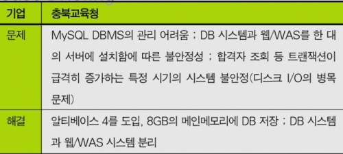 충북교육청 교육정보화과의 홈페이지 담당자는 “DB 시스템의 디스크 I/O 병목 문제도 심했지만, DBMS와 웹/WAS를 한 대의 서버에서 운영함에 따른 로드 분산 문제가 가장 큰 원인이라고 판단했다”고 설명했다.