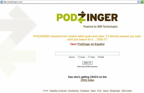 팟징거(podzinger.com)는 자사 사사이트에서 오디오와 비디오 검색 서비스를 제공한다. 물론 파트너들에게 기술도 공급한다. 팟징거는 "전통적인 검색 엔진에서 오디오와 비디오는 사각지대였지만 이제는 아니다"면서 "비디오에서 말을 검색할 수 있는 기술이 이같은 차이를 메웠다"고 설명했다.