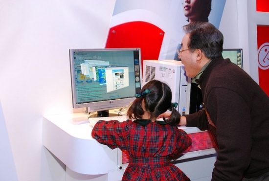 ▲와~ 이게 윈도비스타야! 할아버지와 여자 아이가 윈도비스타가 탑재된 PC를 놀라운듯 바라보고 있습니 다. MS는 이 장면을 연출하기 위해 사람들을 사전에 섭외했습니다. 행사 이름은 '노소동감,윈도비스타 체험하기'입니다.