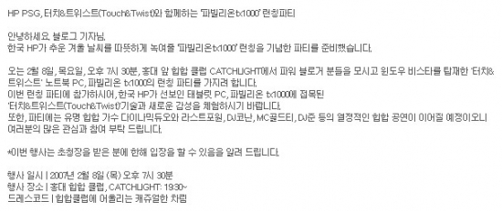 아래 캡쳐면은 HP PSG 부분에서 블로그를 파티에 초정해 '파빌리온tx1000' 홍보하려는 목적의 초청창입니다. 현재 각 기업들에서 가장 흔히 쓰이는 방법입니다. 신제품출시 시기에 맞춰 파워블로거의 의견을 듣고, 파워블로거 각자의 블로그에 포스팅 되도록 하는 것인데요.