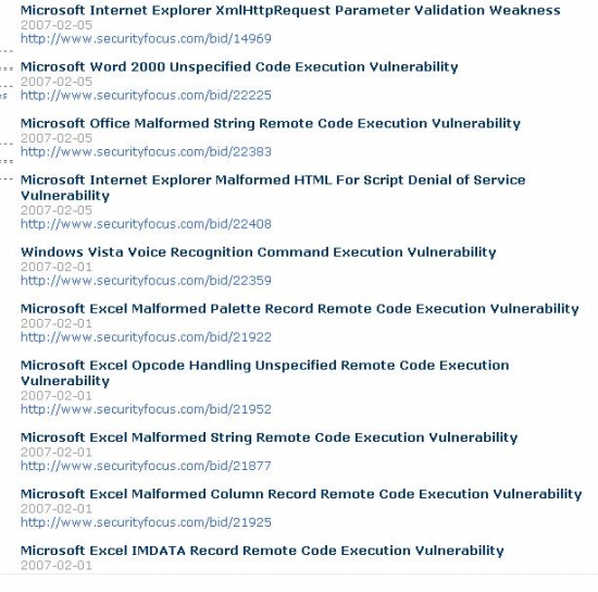 http://www.securityfocus.com/bid 에서 Vendor를 Microsoft로 선택 하시고 보시면 최근 MS제품군에서 발견된 취약성을 확인 할 수 있습니다. 2007년에 발견된 다수의 취약성 대부분이 Office 제품군에서 발견된 것을 확인 할 수 있습니다. 물론 알려진 것 만입니다. 알려지지 않은 취약성이 더욱 많겠죠.