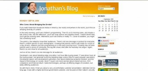 조나단 슈워츠 썬마이크로시스템즈 CEO의 블로그(http://blogs.sun.com/jonathan)가 영어외에 다른 언어로도 번역돼 제공된다. 프랑스어, 중국어는 물론 한국어 버전도 포함돼 있다.